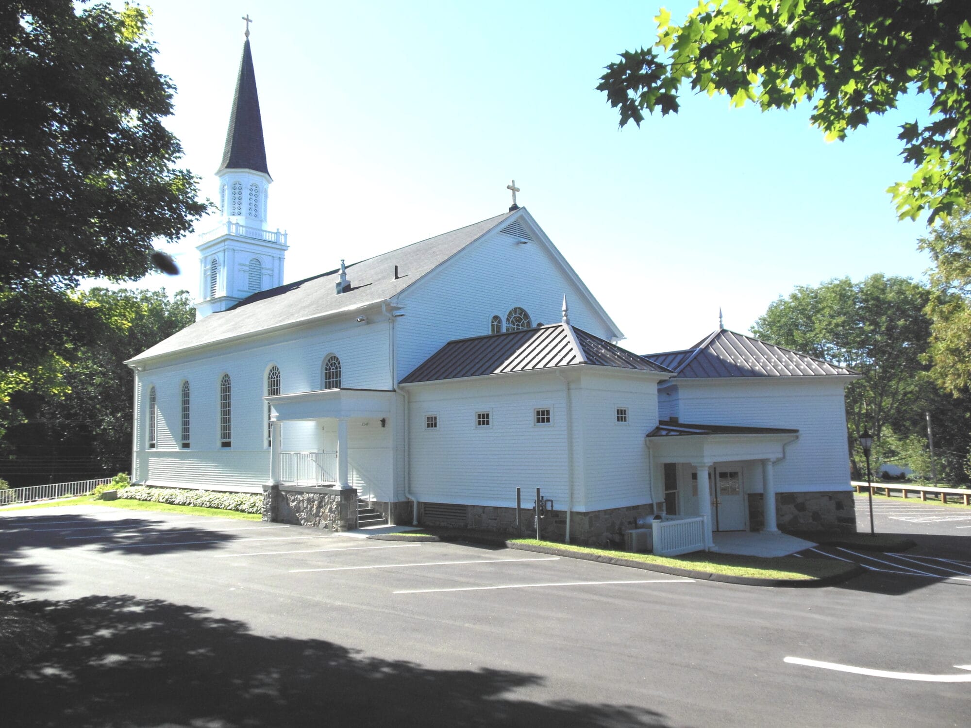 Montagno Construction completed a comprehensive renovation of St. Teresa of Avila Church in Woodbury, CT, both inside and out. The interior work included renovating the sanctuary, nave, and choir loft, with updates to all surfaces and HVAC systems. We transformed the lower level into Seidel Hall, a new community room, and built a new kitchen to serve the congregation. Exterior work included constructing additions to the rear of the church, replacing the roof, restoring the spire, and stripping and painting the existing exterior siding. Additionally, we created a new parking lot, and the church and hall are now fully handicapped accessible.